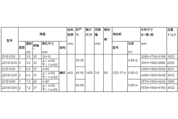 ZWS型振網(wǎng)篩是以振動(dòng)電機(jī)做為振動(dòng)源,牽引篩網(wǎng)及篩框振動(dòng),實(shí)現(xiàn)物料分級(jí)。ZWS振網(wǎng)篩由給料器、篩箱篩面機(jī)體料斗和振網(wǎng)裝置組成。材料由給料器均勻給到篩面,分成篩上產(chǎn)品與篩下產(chǎn)品(單層篩)。本系列振網(wǎng)篩以振動(dòng)電機(jī)為振動(dòng)源,牽引篩網(wǎng)上下振動(dòng),篩機(jī)振幅可調(diào),以適應(yīng)不同物料的分級(jí)。篩網(wǎng)的振動(dòng),一方面可防止篩網(wǎng)堵塞,同時(shí)使物料拋起向前彈跳實(shí)現(xiàn)分級(jí),因而振網(wǎng)篩的篩分效率高。 ZWS型振網(wǎng)篩主要特點(diǎn): 1.密封防塵,維修方便。 2.篩機(jī)振幅可調(diào),篩分效率高。 3.生產(chǎn)能力大,動(dòng)負(fù)荷小,噪音低。參數(shù)